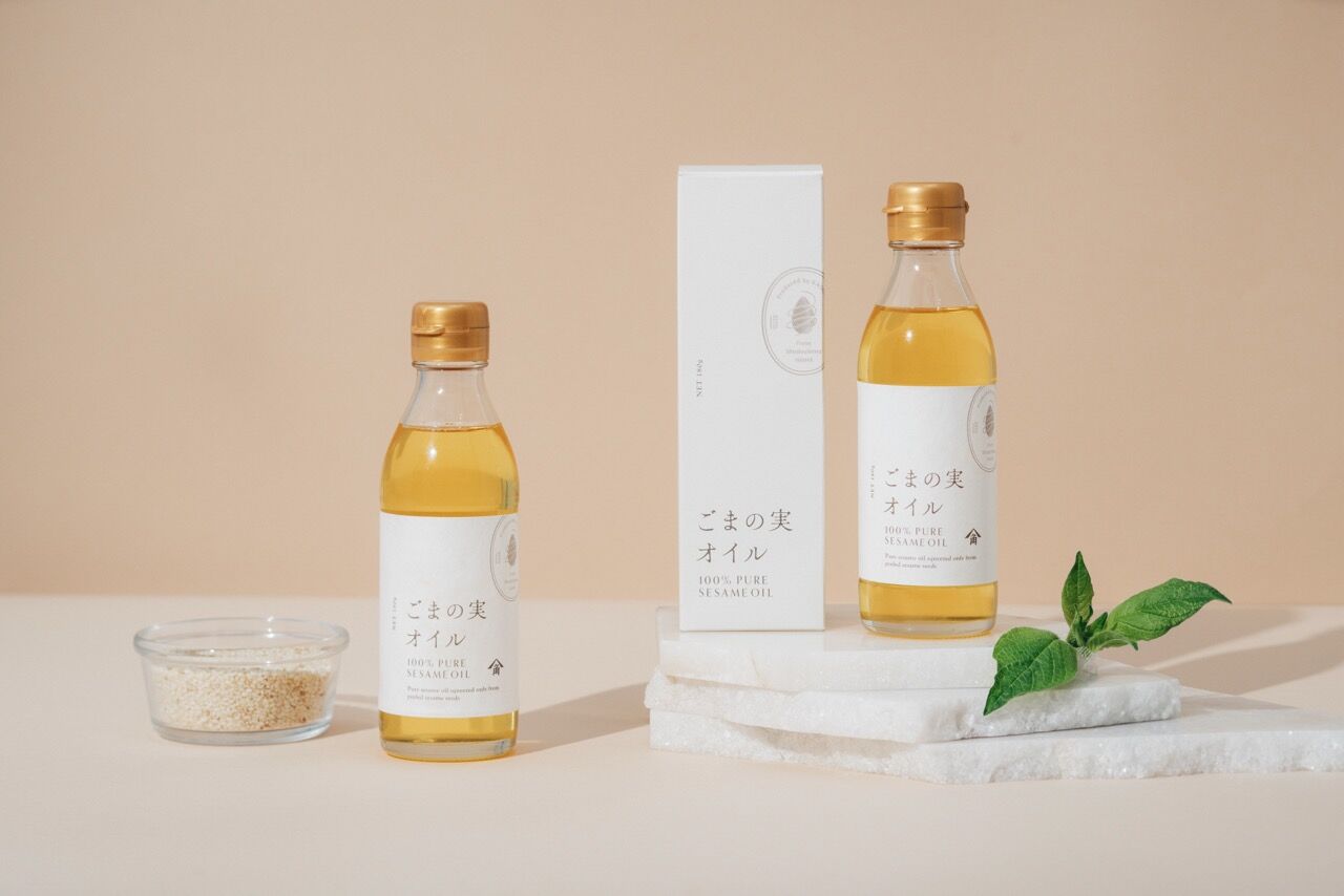 従来のごま油は、ごまの皮の部分も一緒に絞っていますが、この「ごまの実オイル」は黄金に輝くオイルで、ごま同士の摩擦で皮を取り除き、ごまの実の部分だけを絞って作られています。